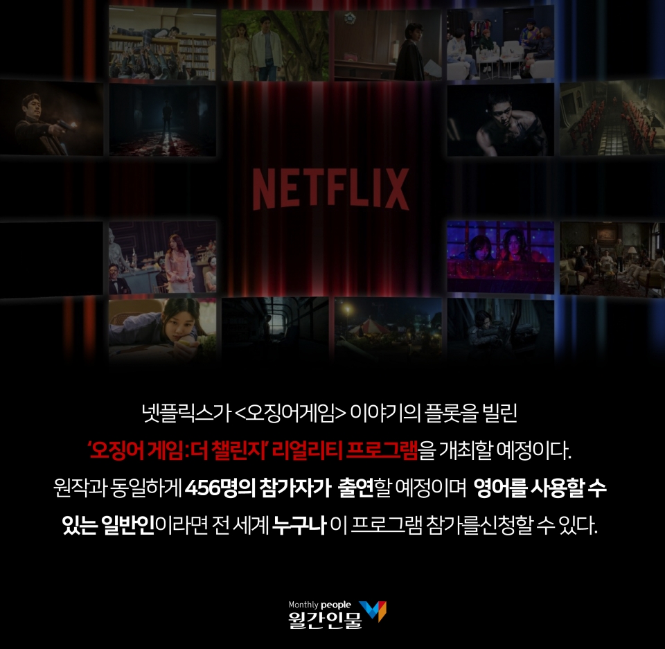 넷플릭스는 이날 공식 트위터 계정을 통해 한국 드라마 '오징어 게임' 이야기를 기반으로 한 456만 달러(58억 8000만 원)상금을 놓고 456명의 참가자들이 실제 경쟁을 벌이는 '오징어 게임:더 챌린지' 리얼리티 프로그램을 제작한다고 밝혔다.